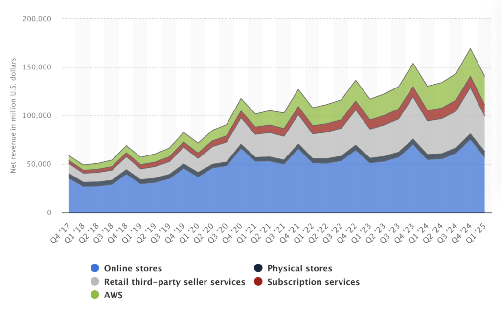 Global net revenue of Amazon.com from 4th quarter 2017 to 1st quarter 2025, by product group